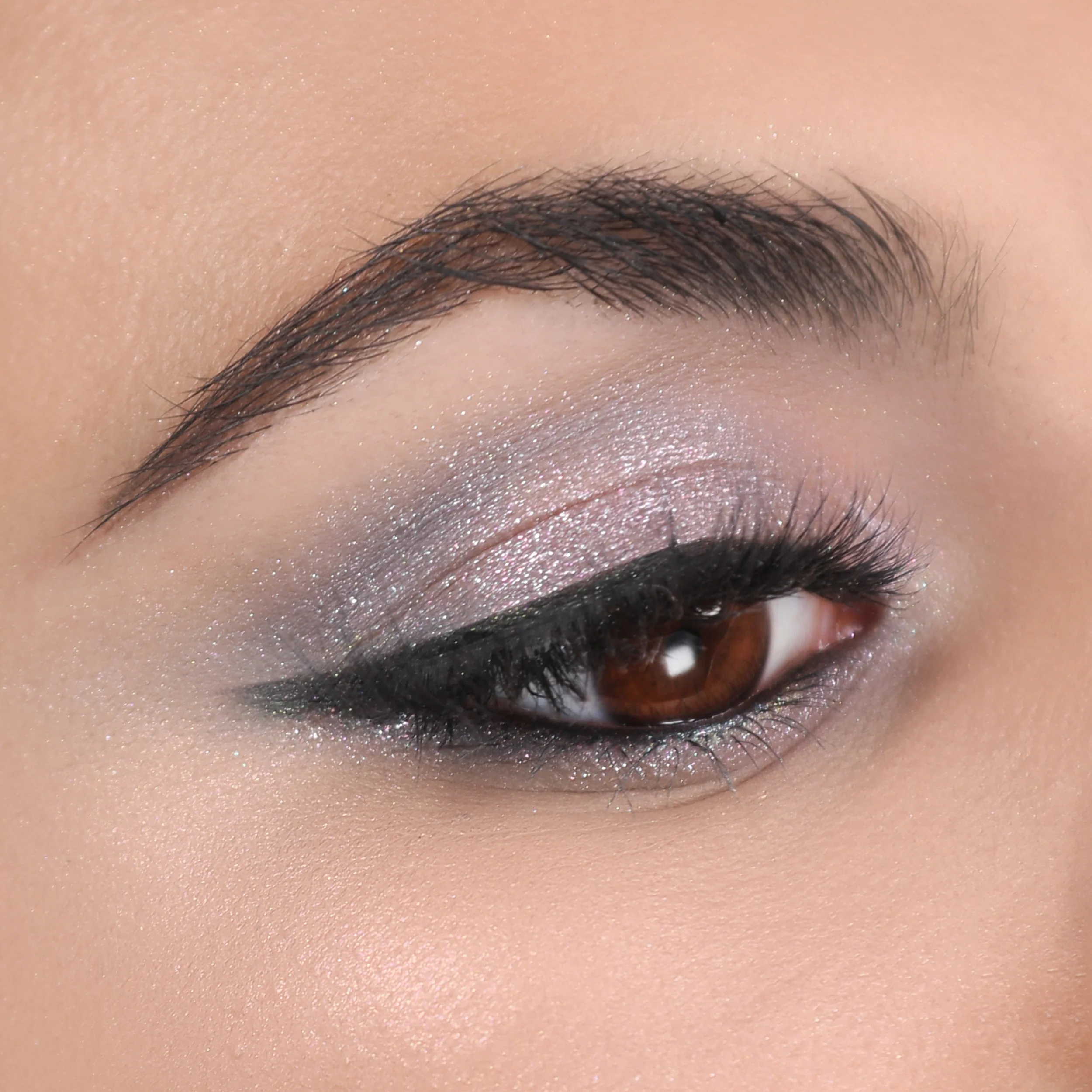 Then, pack on color with a flat or firm brush and blend with a fluffier brush for a more all-over sparkle. Alternatively, use your fingertips to create the desired effect.